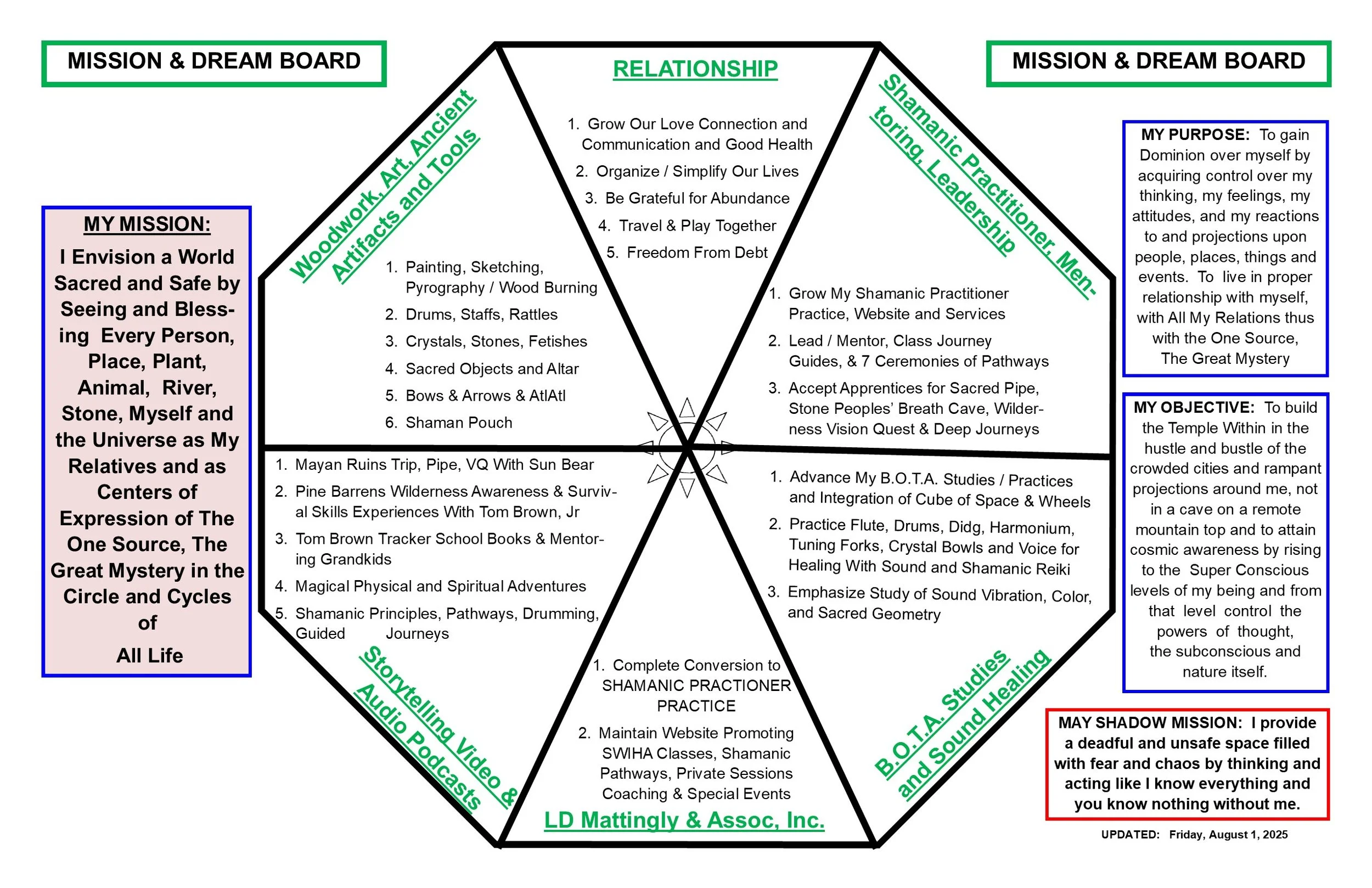 Once you have a Mission, you can grow it into specific areas of your life. You can also include your personal Purpose and Objectives. All this can then serve you as your Dream Board, your Mission, your Life Journey Map.